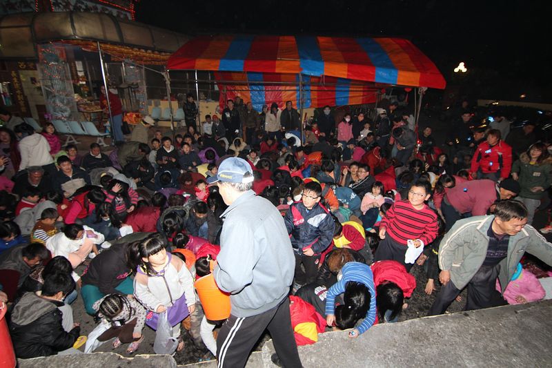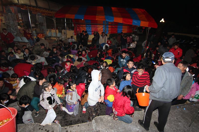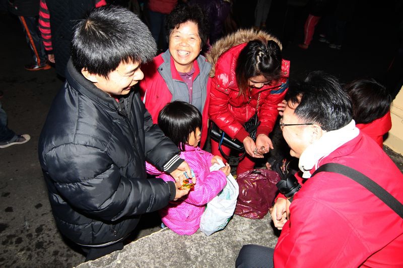 晚上七點半準時撒發財金,由當地老人會長負責撒放;(↑)撿拾發財金的要領就是頭要低,不要看空中的金幣,只要低頭撿拾就可以,(↓)且也可以避免被金幣打到臉龐。