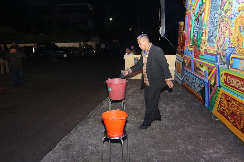 撒發財金前,由台中聲五洲布袋戲團團主王金匙先生(上圖↑)先做祈福儀式,拜請金母娘娘駕臨,加持桶內的金幣(五圓和十圓的硬幣),讓撿拾到的人能獲得庇佑,會賺到更多的錢。