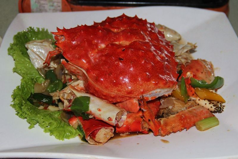海產店老闆說這隻帝王蟹夠大,可以把牠分為炒和煮湯