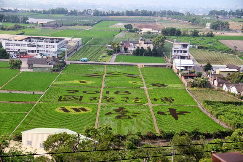 備註:痞客格友總幹事問稻田彩繪是噴漆的嗎?且日後彩繪部分能否吃?根據規劃人員表示,彩繪稻田是以黑糯米、稻米交織栽植的,因鄰近苑裡鎮農會近年規劃稻田彩繪有成,特地請教苑裡農會專家而設計出來的;既是黑糯米和稻穀交織栽種,所以日後收割當然能吃。
