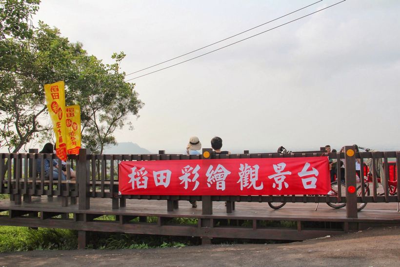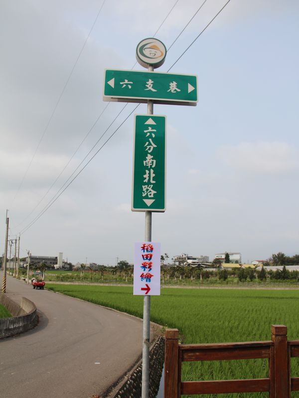 外埔是農業地區,雖掛台中市美名,但偏處鄉下,產業道路非常多,在鄉間小路亂繞之下,終於看到這塊小塑膠牌書寫『稻田彩繪』四個字,再按指示方向,才上了山頂的觀景台。