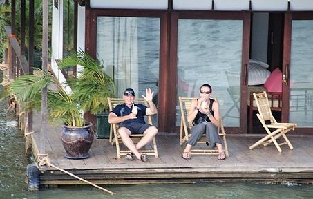 圖右這對美國藉夫婦非常悠閒的在船上欣賞四臂河的黃昏美景(↓),並一邊飲啜著咖啡,看到我在拍照河邊風光,很高興的向我揮手打招呼!(→)