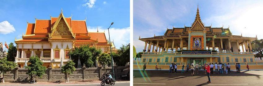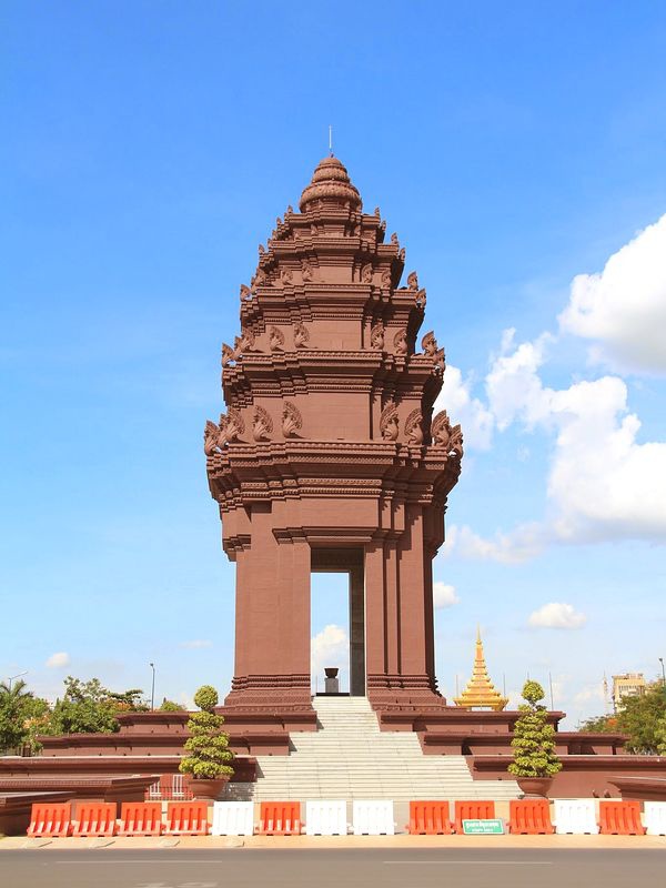 上圖是柬埔寨的皇宮(↑),此皇宮為傳統的高棉式建築;下圖(↓)則位於柬埔寨首都金邊市區的獨立建國紀念碑。此碑建於1953年,為紀念柬埔寨脫離法國殖民成立王國而建立,塔狀的外型高達五層,每層屋簷四個角落,各有五尊多頭的Naga石雕。據說紀念碑藍圖的靈感是來自吳哥Bakong神殿,該建築融合柬埔寨文化及歷史,是高棉今日之柬埔寨獨立的標誌。
