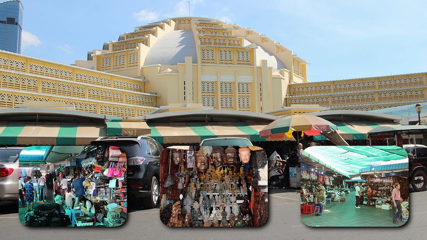 上圖(↑)中央市場–金邊中央市場位於金邊市中心,是金邊最大和最繁忙的市場。1937年由法國建築設計師設計並建造的。大圓形的屋頂,從空中俯視就像一個巨型電風扇,建築內部無梁無柱,四通八達,結構非常奇特、新穎,是金邊非常明顯的地標建築。