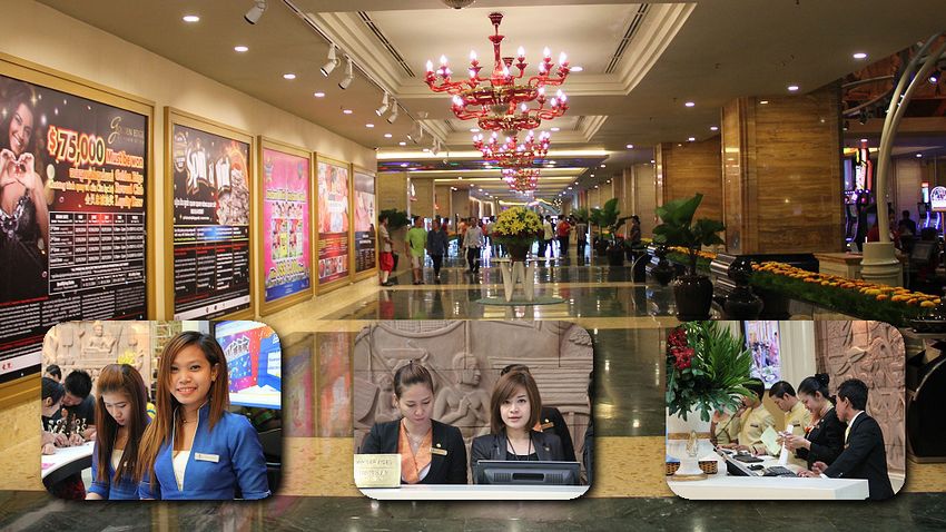 下圖(↓)金界賭場–金界賭場是金邊唯一擁有執照的賭場,也是方圓兩百公里以內規模最大的豪華娛樂賭城。提供博彩、娛樂及康樂設施,包括八層高的娛樂城,十四層高的酒店大樓及一幢停車場,擁有525間房,176張賭桌及200多部博彩機(俗稱老虎機)。