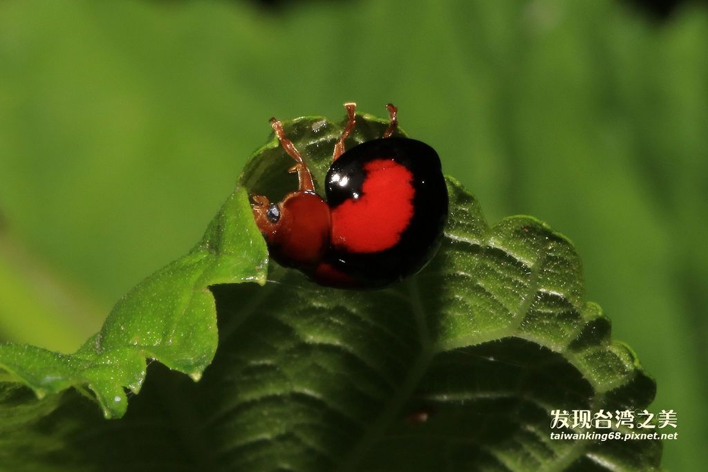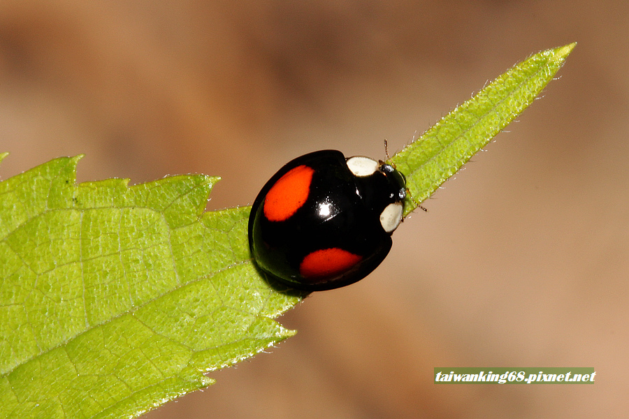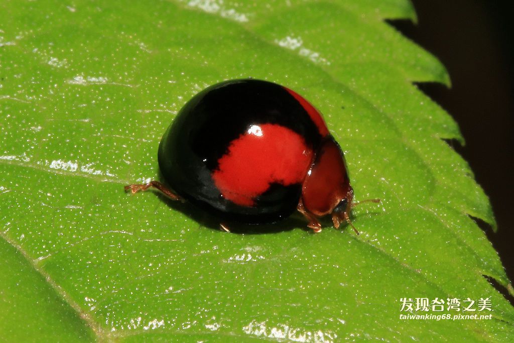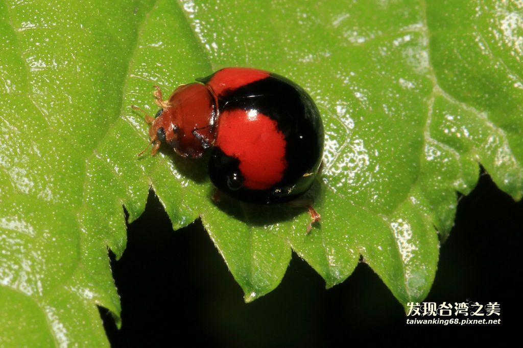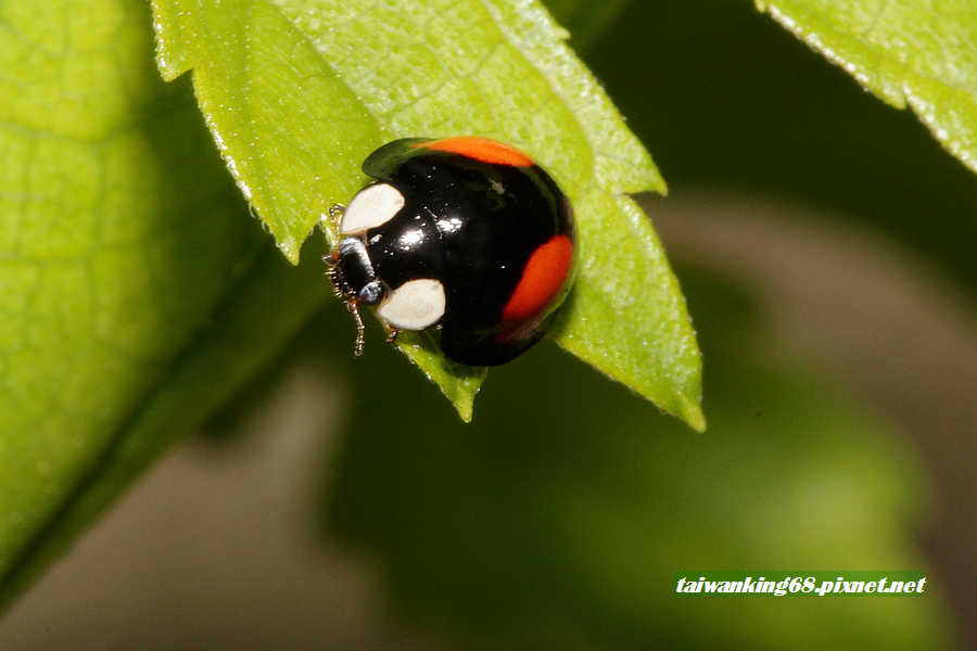 紅紋瓢蟲:瓢蟲科,體長5–6mm,前胸背板及頭部紅色或橙紅色,翅鞘黑色,左右各有兩枚橙紅色斜向的斑紋,末端不及前緣。(資料取自嘎嘎昆蟲網站)