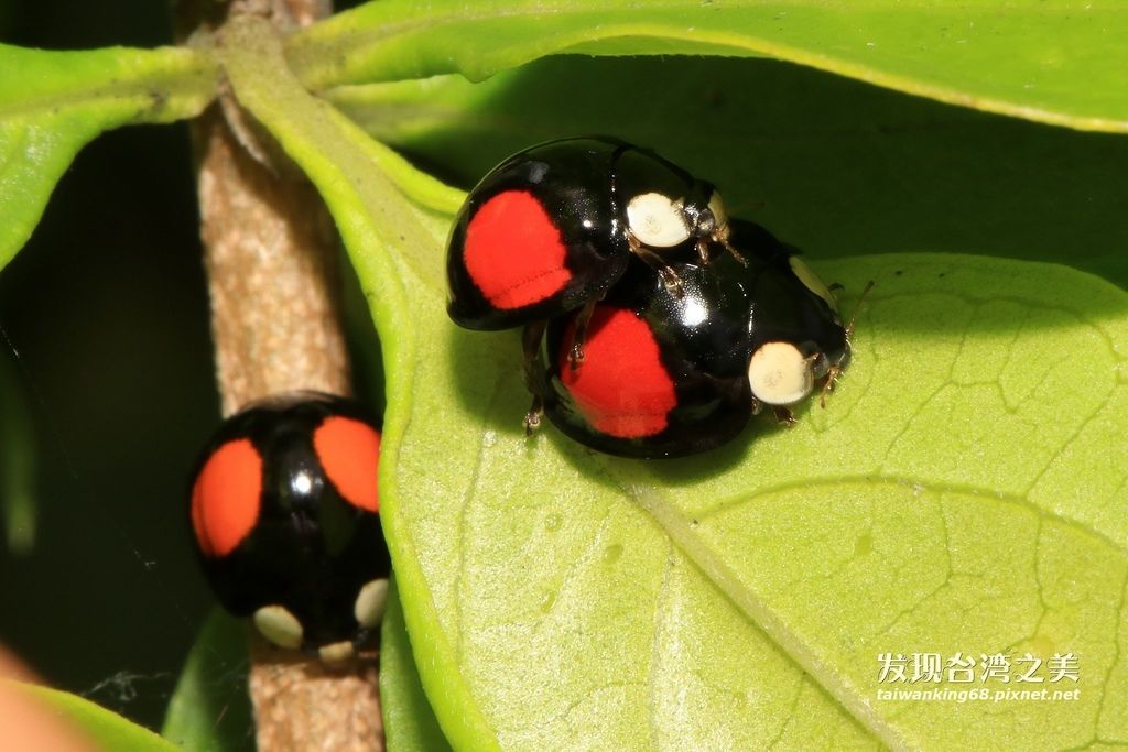 上圖左邊交配中的赤星瓢蟲,上為雄蟲,下為雌蟲,
