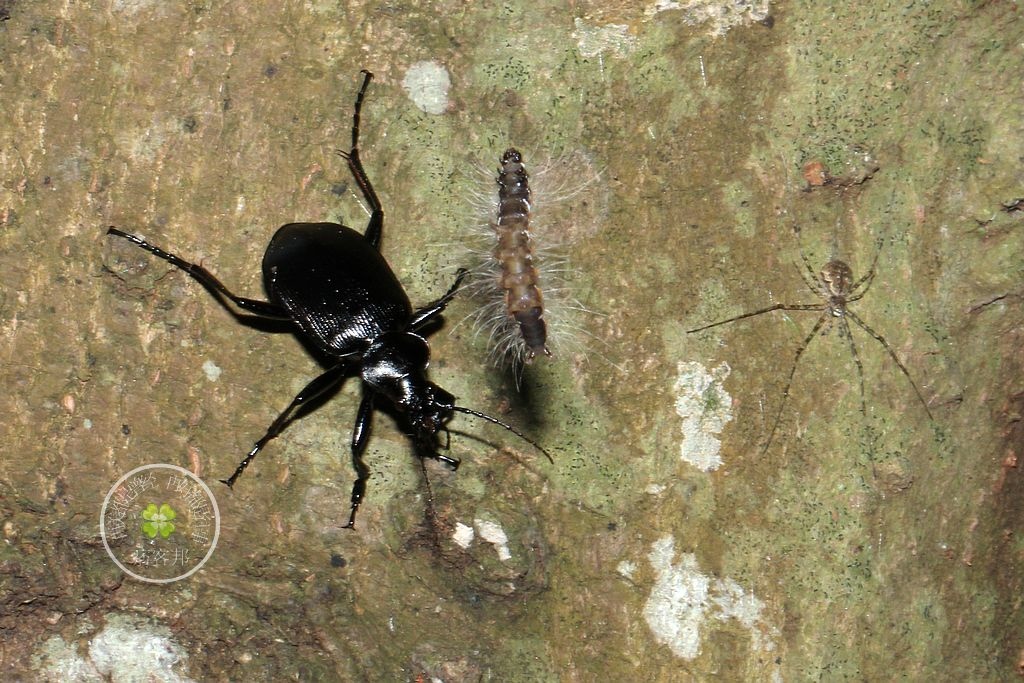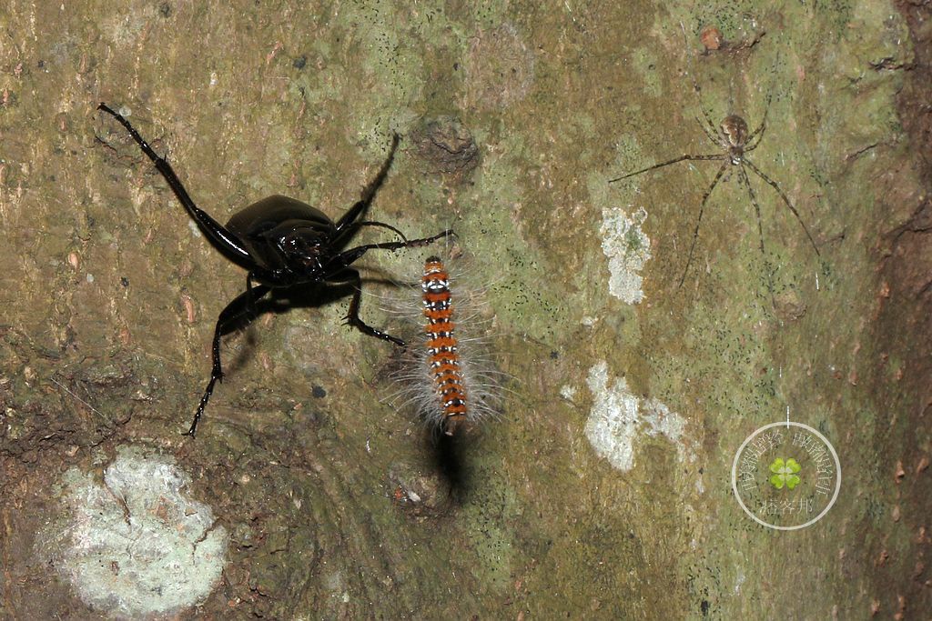 一隻暗點燈蛾幼蟲吐絲從空而降,黑長迴木蟲順勢撲上去(↑)