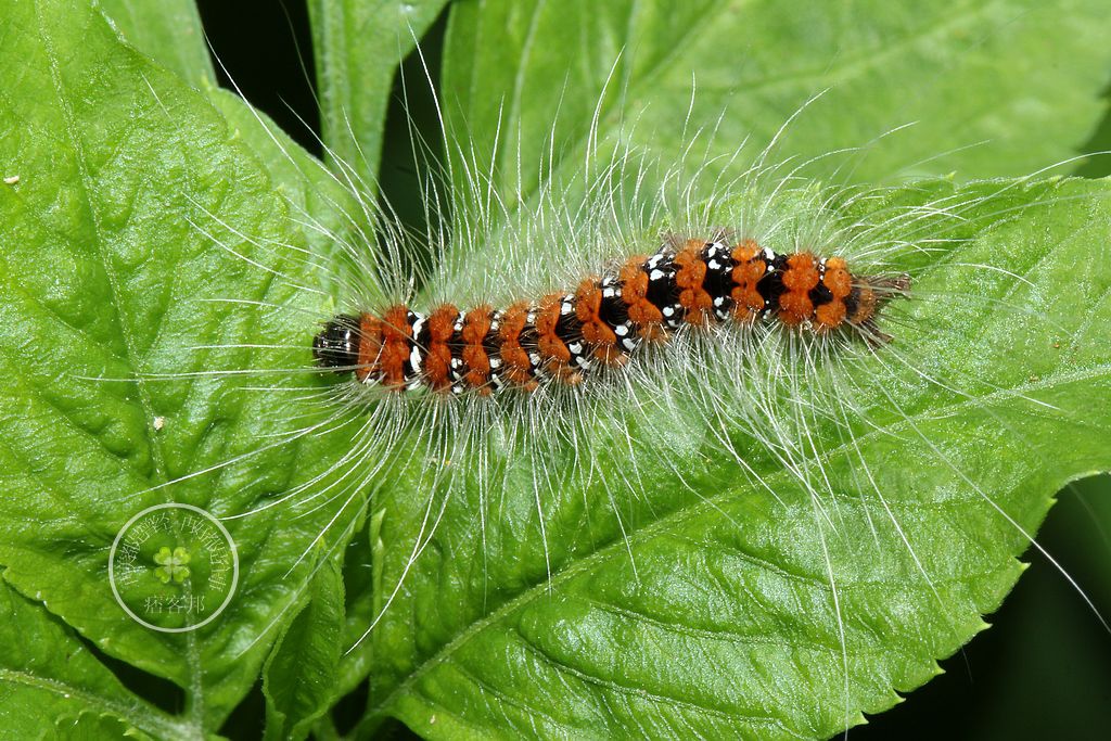 〝暗點燈蛾的幼蟲〞,腹背具橙色的橫紋,中央有一條白色不相連的斑點達腹端(↑)