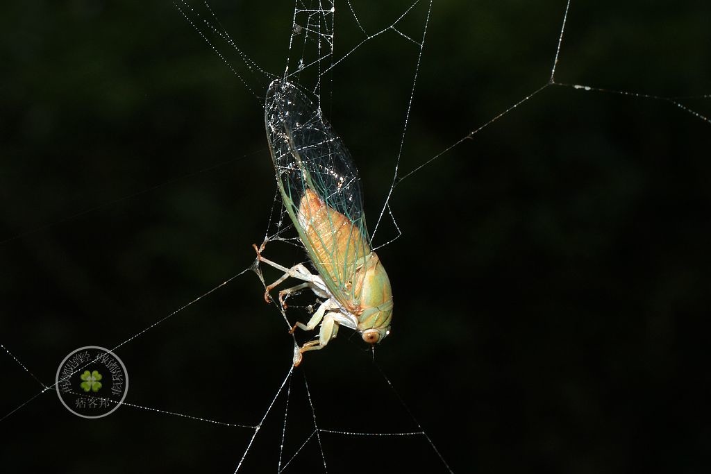 被點眼金蛛網住的蟬(↓ ),牠的下場就是淪為蜘蛛的腹中物