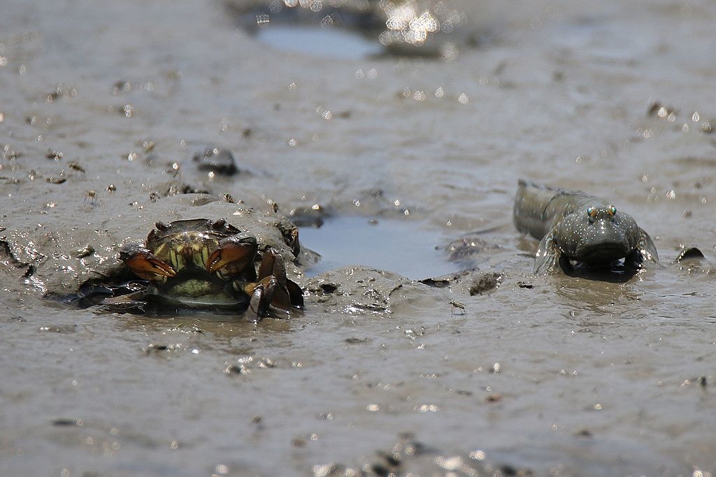 彈塗魚有多大?牠旁邊剛好有隻螃蟹可做對比,兩者差不多(↑)