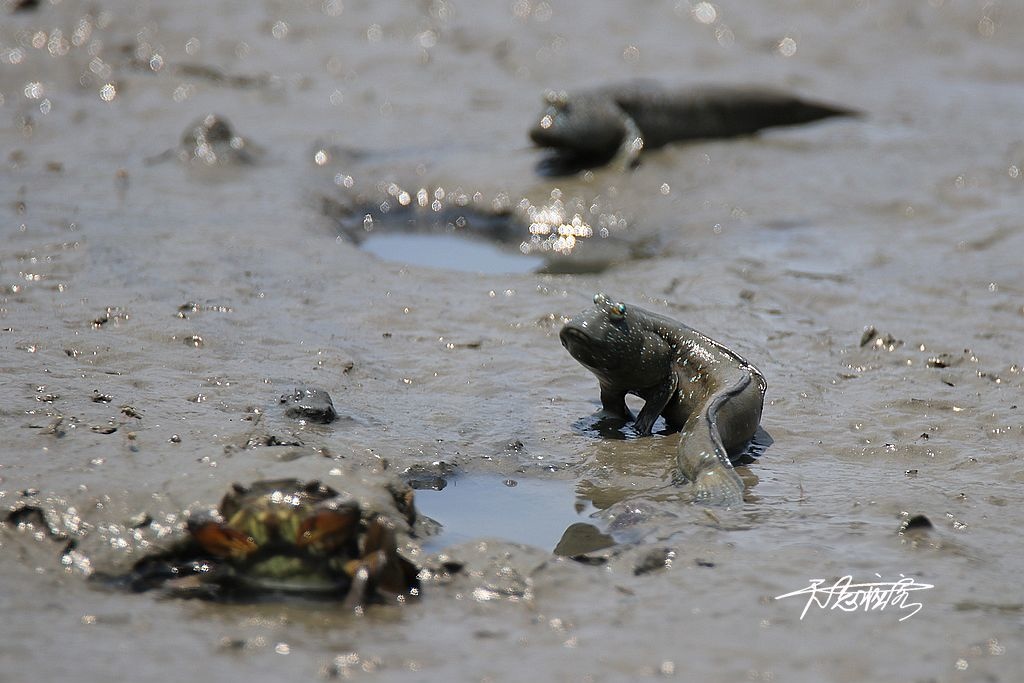 彈塗魚以螃蟹和昆蟲為主食;上左圖(↗)就是彈塗魚追逐小螃蟹的畫面