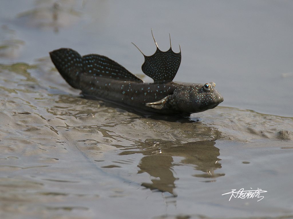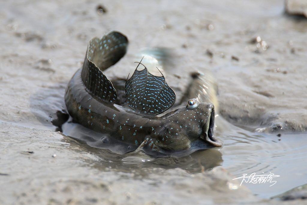 大彈塗魚以泥灘上的藻類和碎屑為主食,體型較大,身上有螢光藍點,大彈塗的胸鰭在中間接合及前彎,有如枴杖,有助彈跳或爬行;當潮退後,大彈塗魚會其從洞內爬出。