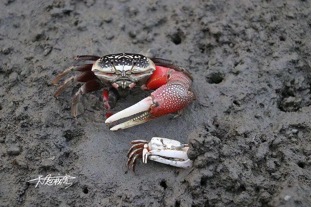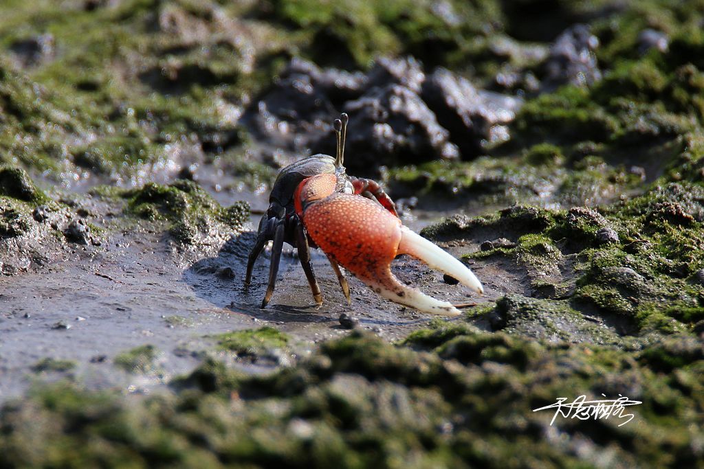 招潮蟹:招潮蟹屬(學名 Uca),又名招潮屬、提琴手蟹,屬中包含95個種。其最大的特徵是雄蟹擁有一大一小相差懸殊的一對螯。招潮蟹會做出舞動大螯的動作,像是在呼喚潮水似的,所以得名;這動作也像在拉小提琴,所以又叫作「提琴手蟹」。