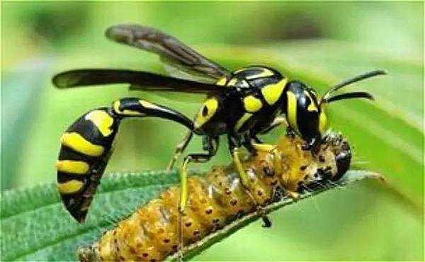 蜾蠃(↑):別名土蜂、細腰蜂、蠮螉、蒲盧。體形似蜂,因為牠的腰非常纖細,故稱之為細腰蜂。蜾蠃用泥土在樹枝上築巢。常捕食害蟲,有益於農作物的生長。(蠮螉音讀一ㄝ ㄨㄥ)