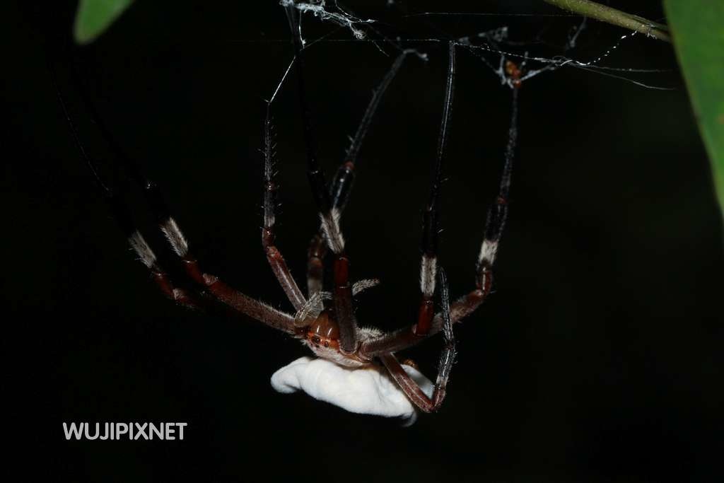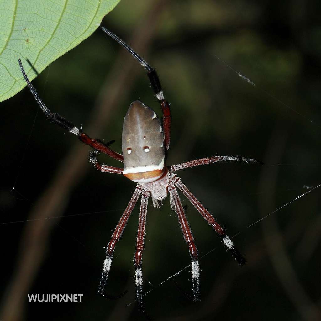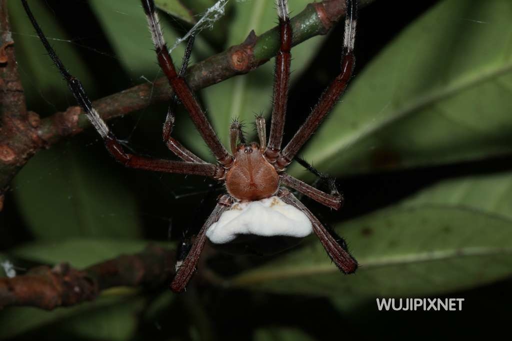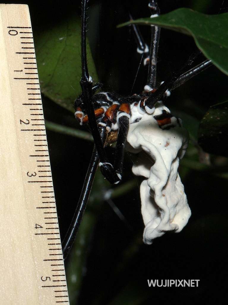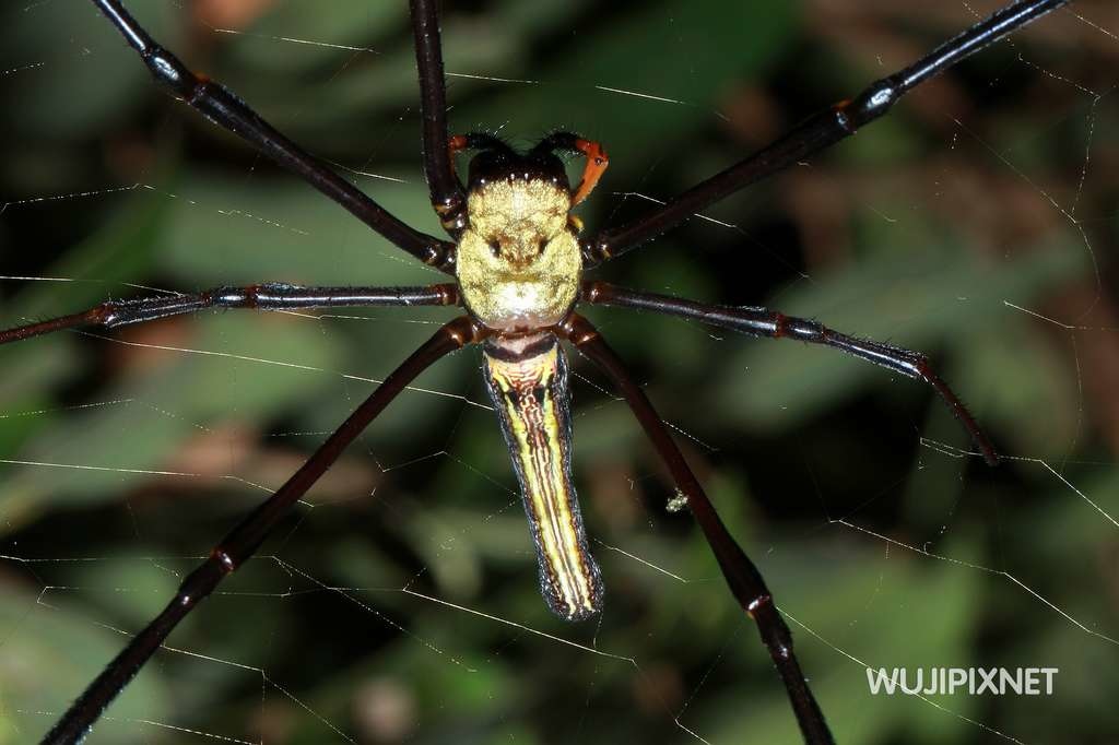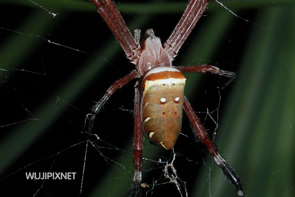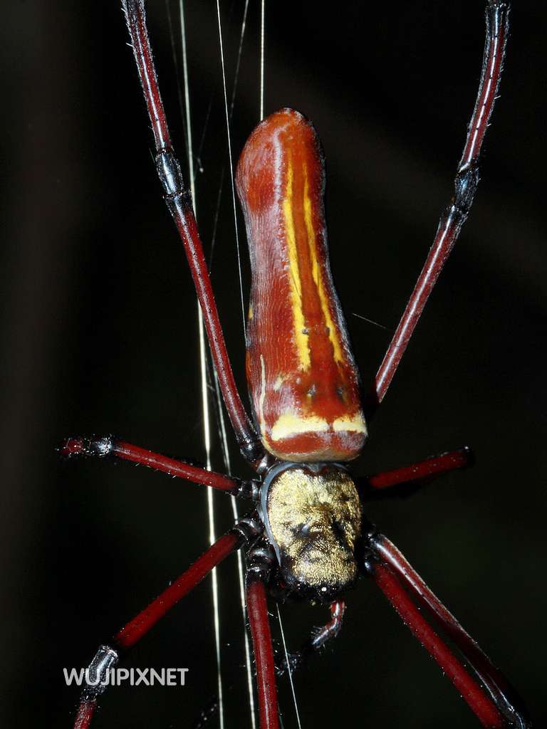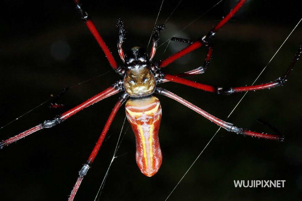 紅色個體人面蜘蛛(↑)腹背紅色,中央有黃色的縱紋,雌蛛體長30-50mm,雄蛛5-10mm