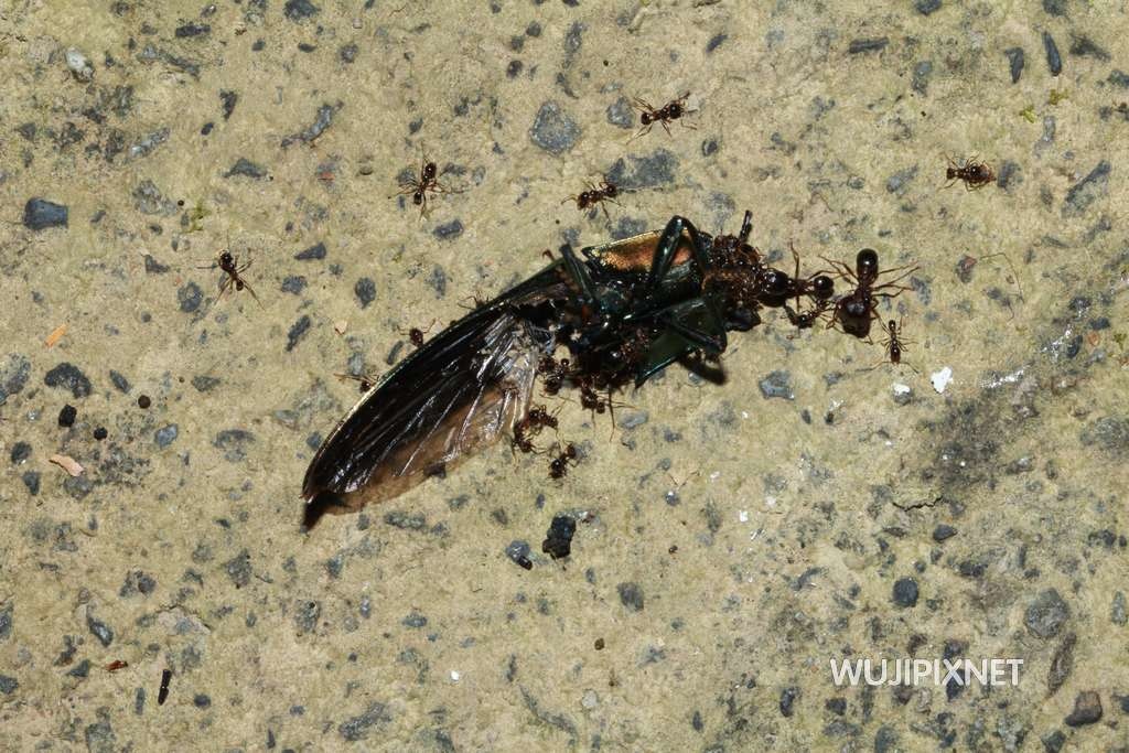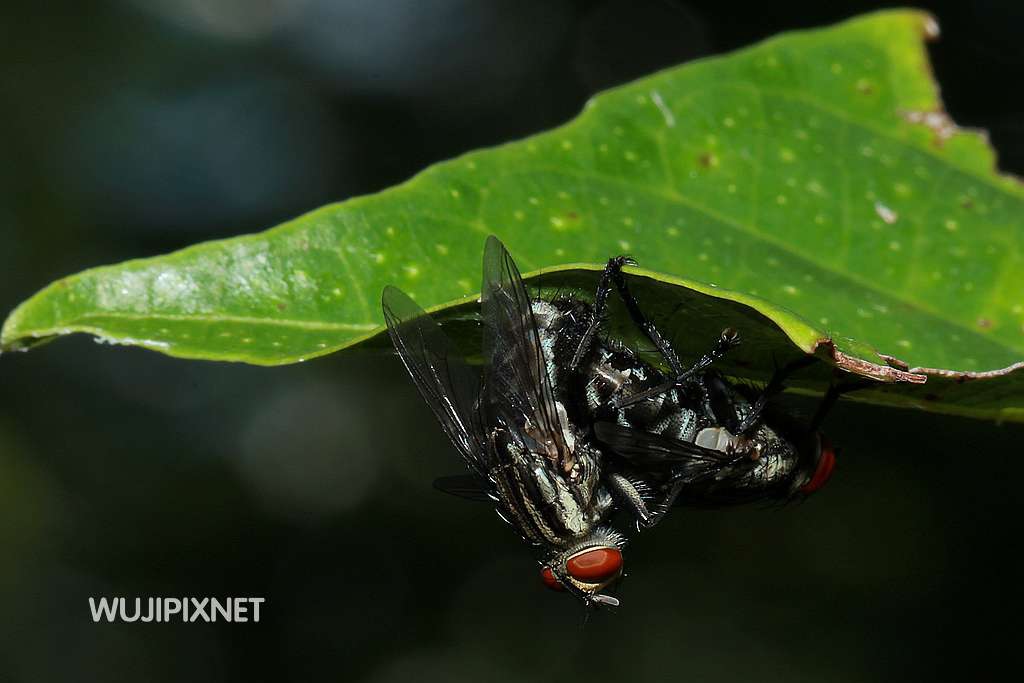 肉蠅交尾(↑):肉蠅科,體長10–12mm,體色灰色,前胸背板有三條黑色的縱帶斑紋,觸角附節為羽毛狀,口器為舐吮式,取食時口吻部會膨脹翻出,利用唾液溶解物質後再舐吸,這種取食的方式最容易造成病菌的傳播。