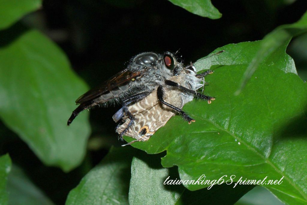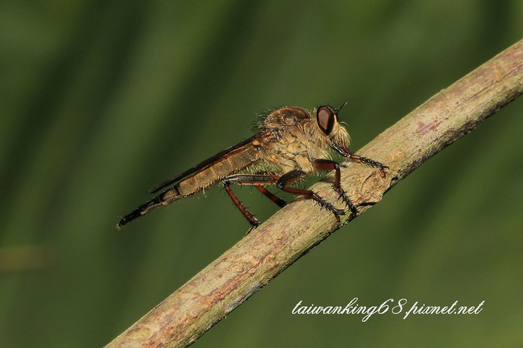 食蟲虻(↑):食蟲虻科,體長約10至14mm,頭部具黃色長毛,複眼黑色,觸角短,前胸背板褐色,後端密生黑色長毛,翅膀褐色,腹部具黃褐色絨毛,各腳除腿節黑色餘為褐色,腳節背面具長毛,跗節各小節兩側具毛刺。