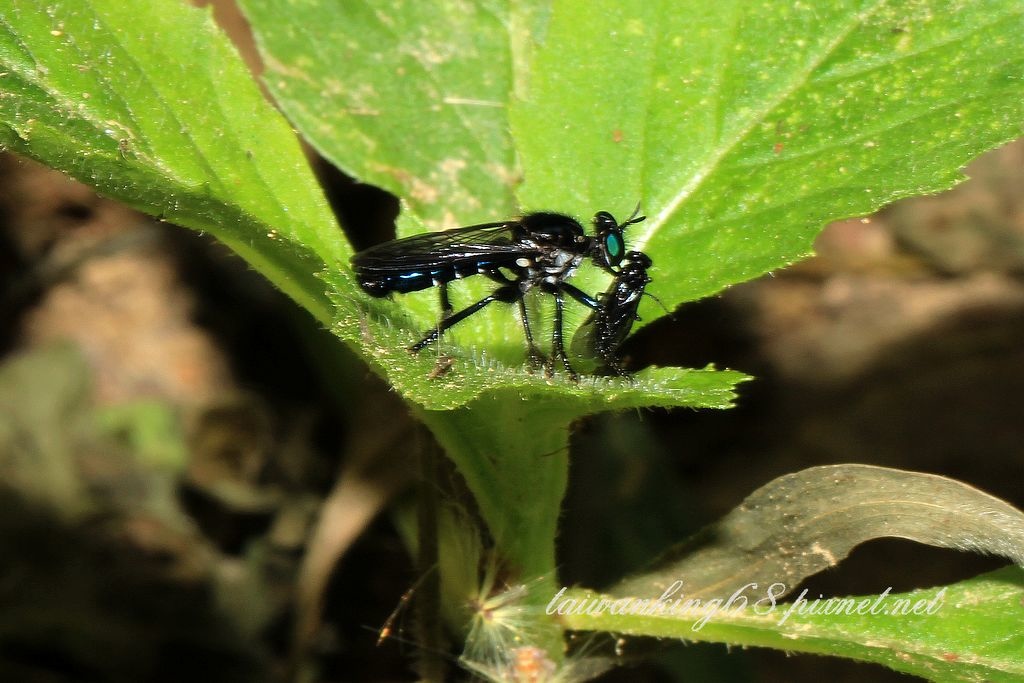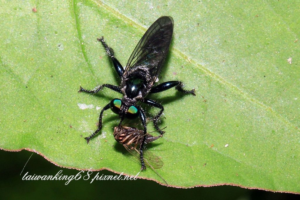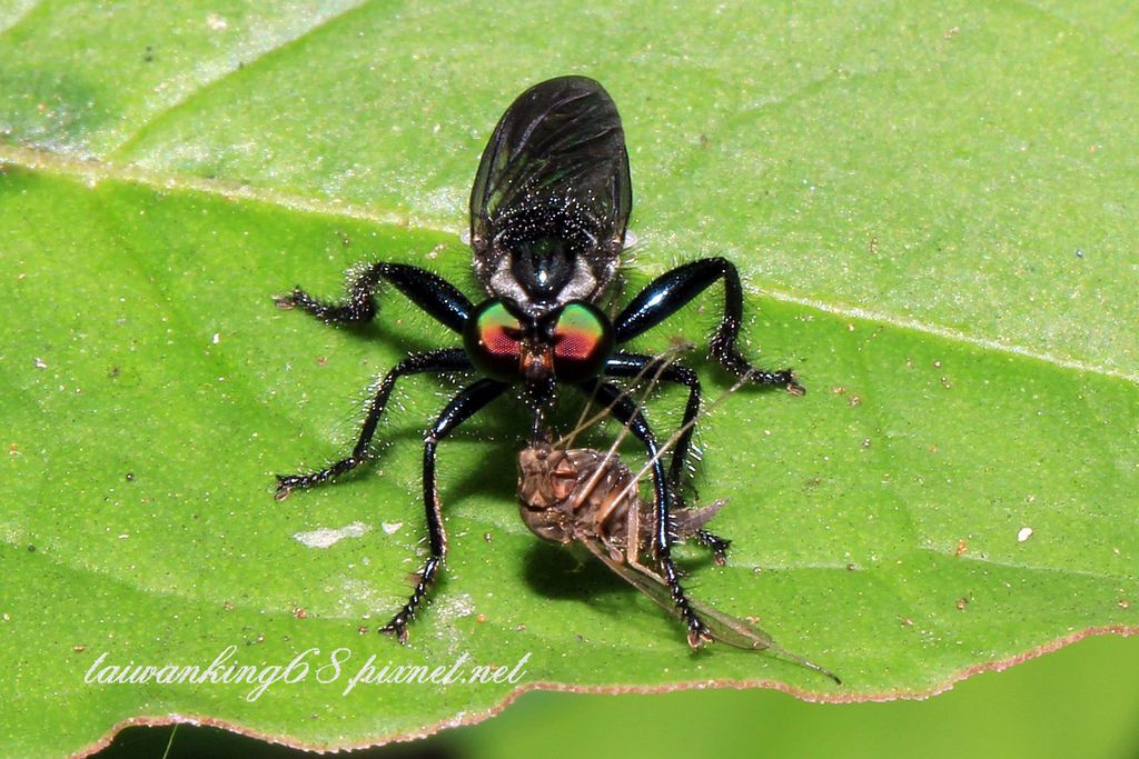 形態特徵:食蟲虻科,體長14.5mm,本種小型,體背及各腳黑色具藍色光澤,複眼具藍、橙色的七彩光斑,色彩鮮艷。