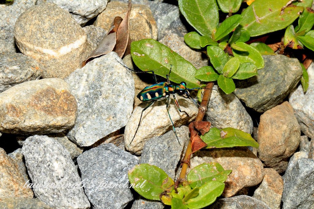 八星虎甲蟲不容易拍攝,牠的體長和蚊子差不多,八星虎甲蟲在太陽照射下會散發七彩光斑,非常醒目和漂亮。牠的警覺性高,飛的速度也很快,我只拍一張照片就被牠飛走。