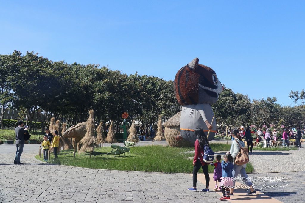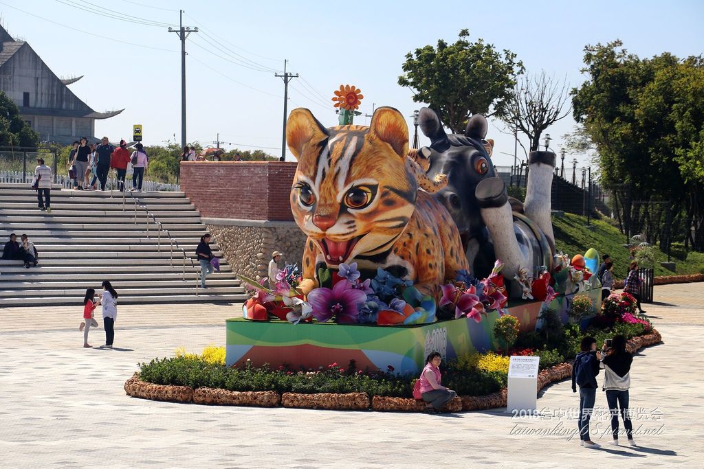 台中世界花卉博覽會外埔園區入口處高達五公尺的的稻草人「樂耘虎爸」(上左圖),以及去年更勇奪國慶花車網路人氣競賽冠軍,全長19公尺,最高五公尺的石虎花車(上右圖)。