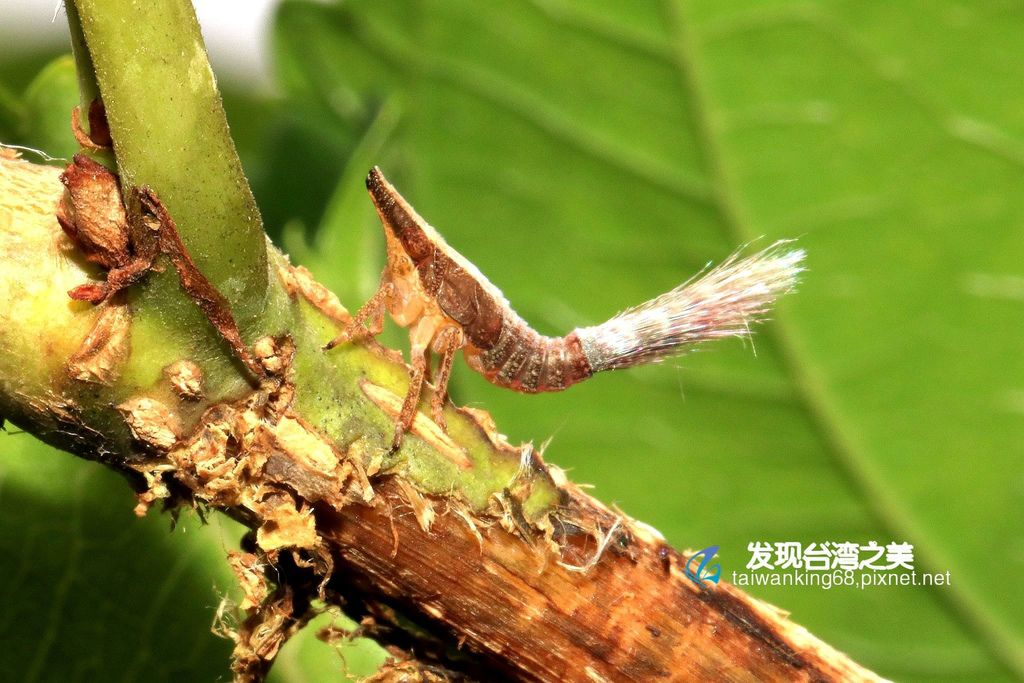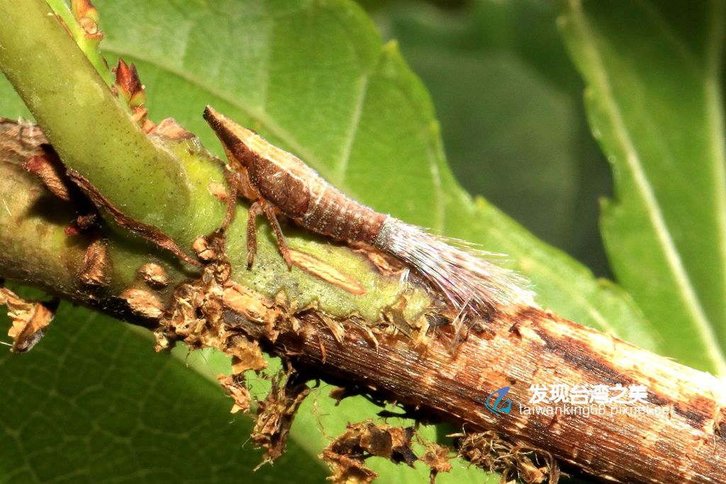 原本頭尾兩端翹的若蟲,可能接到母蟲示警,馬上趴在樹幹作自我保護。(↑)