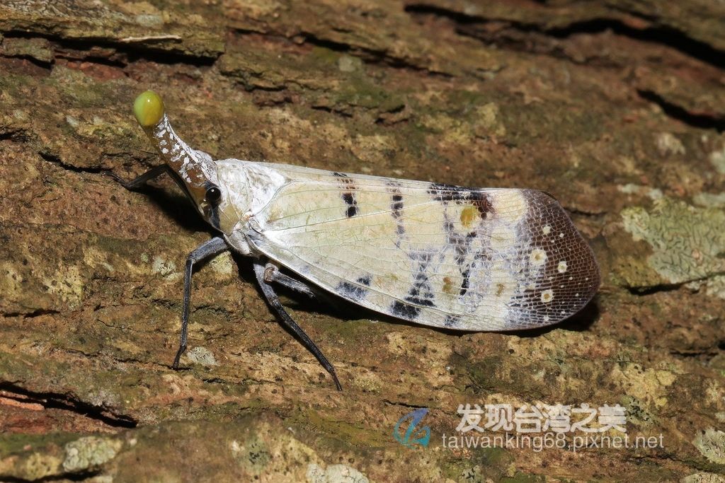 渡邊長吻白蠟蟬(渡邊氏東方蠟蟬):蠟蟬科,體長65–80mm,體型狹長,頭部延伸呈棒狀突出,末端黃色如球狀,全身佈滿白色粉狀,翅型寬大,翅外緣褐色具白色斑點,腹面紅紫色。