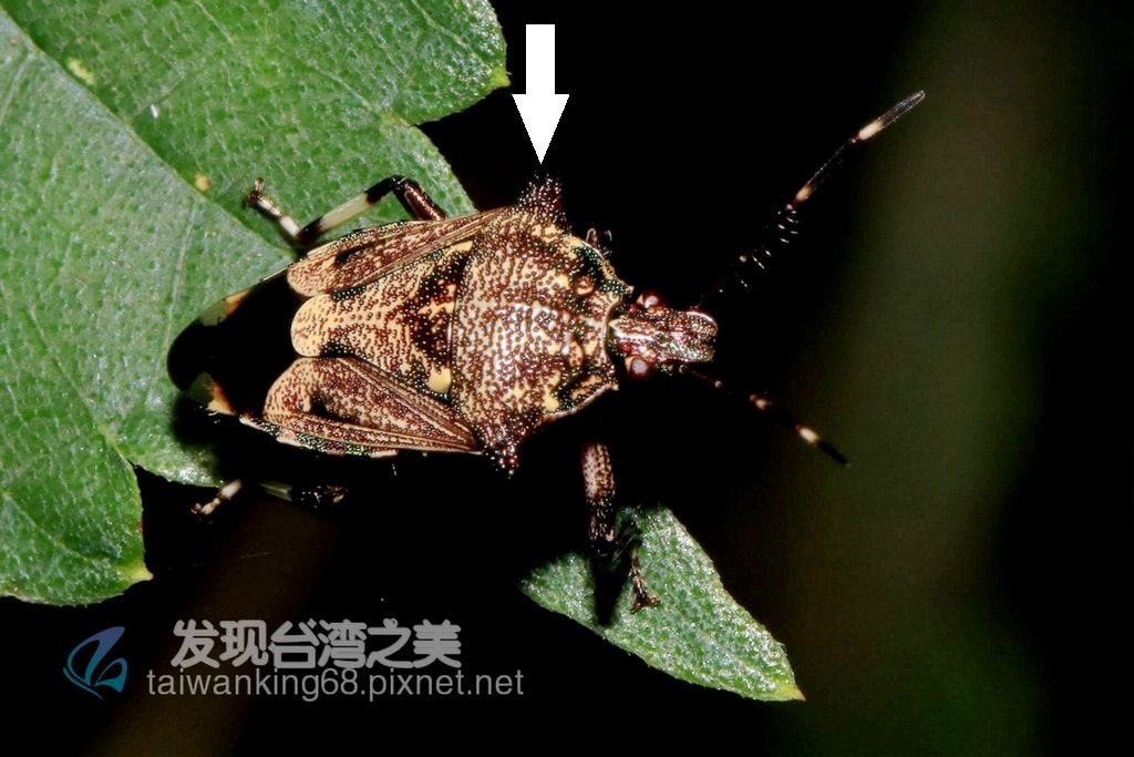 叉角厲椿象(↑):椿科,厲椿屬,體長11–13mm,頭部黑色,背面有三條黃色縱帶,前胸背板黑色散生許多黃色的碎斑並具凹凸的坑洞,側角向外延伸,末端分叉尖銳,小楯板黑色,基部有三枚鮮艷的黃色斑點呈橫向排列,前翅革質黑色,腹部外露,各腳具黑、白斑。