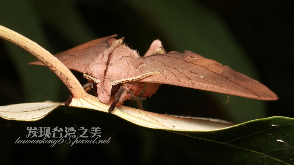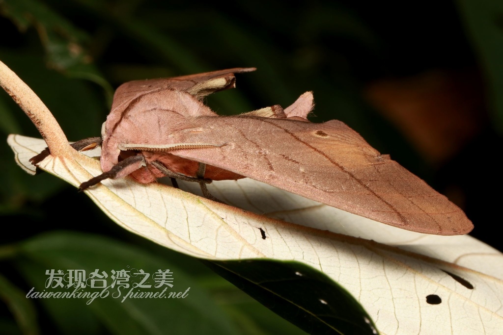 缺六點天蛾(↑):天蛾科,展翅110mm,翅面褐色,胸、腹背具黑褐色細中線,前翅有6–7條黑褐色的細橫帶,外線最粗,近後緣端向上傾斜,下方各有一枚黑褐色圓斑,條紋相當細緻漂亮。
