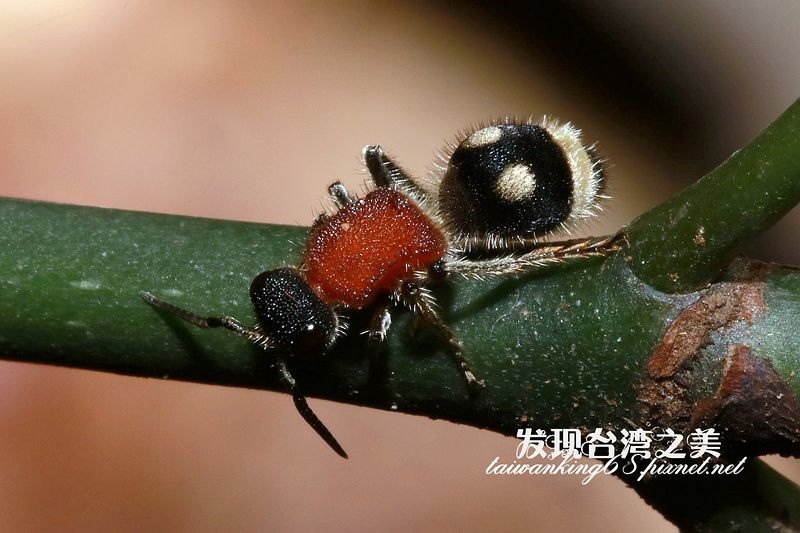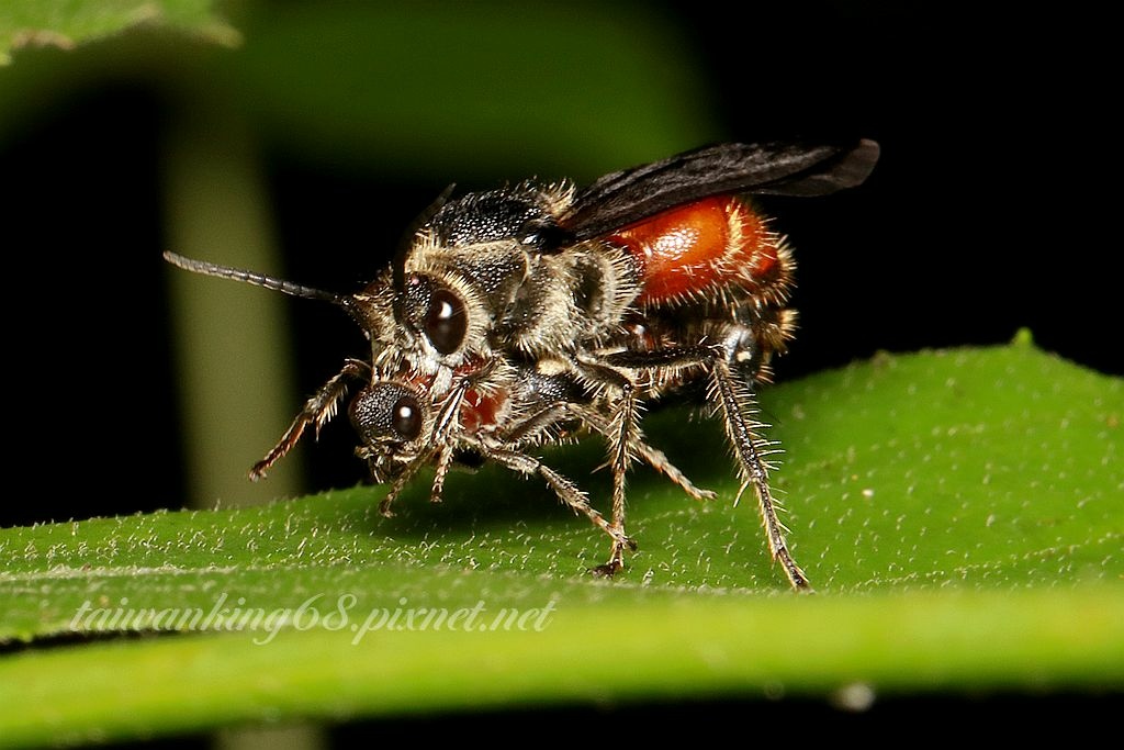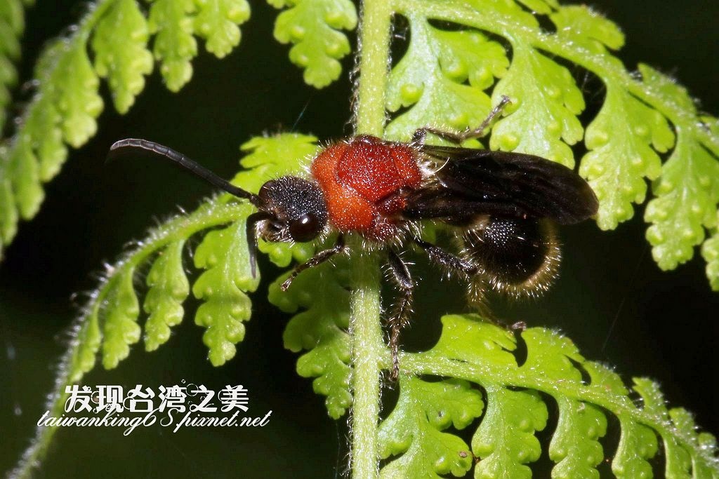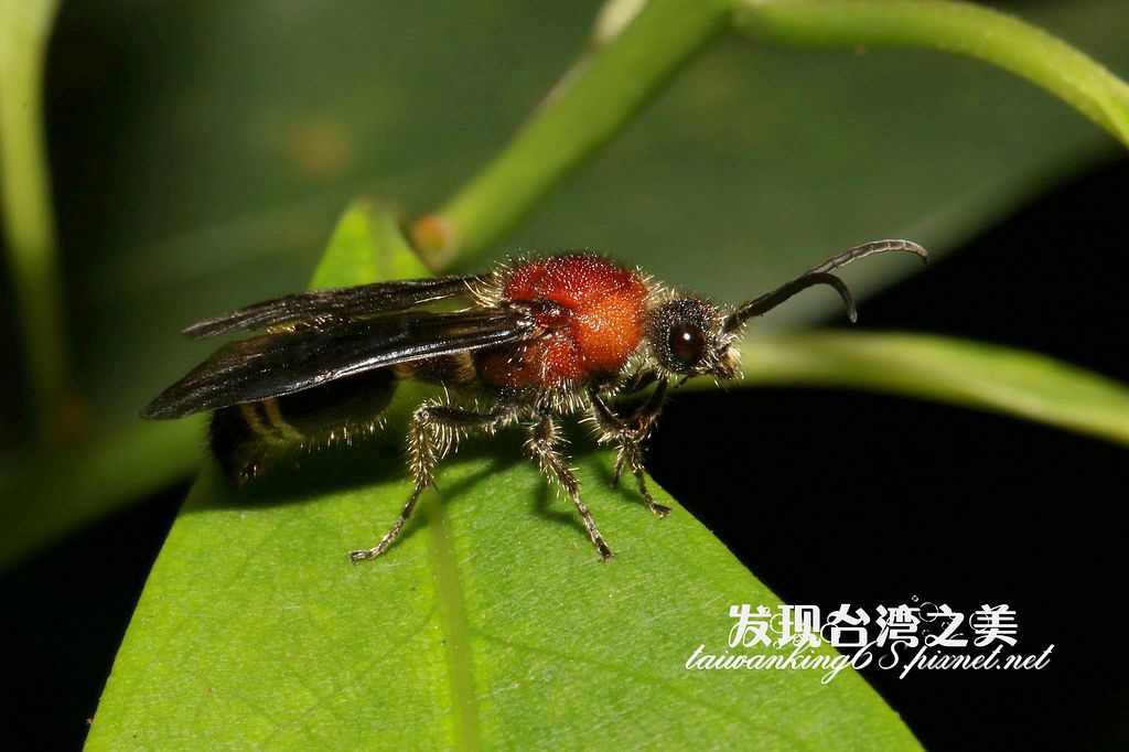 絨蟻蜂(雌):體長9.5mm,蟻蜂科。雌蟲體長9.5–10mm,雄12–17mm,雌蟲無翅,胸部橙紅色,腹部黑色有兩枚白色圓斑,全身長滿短絨毛,常見於地面爬行形態似蟻,故名絨「蟻」蜂,雄蟲有翅,體長比雌蟲大很多,胸部黑色,腹部紅棕色,1–2節較窄但無柄,末端黑色,翅膀棕黑色。