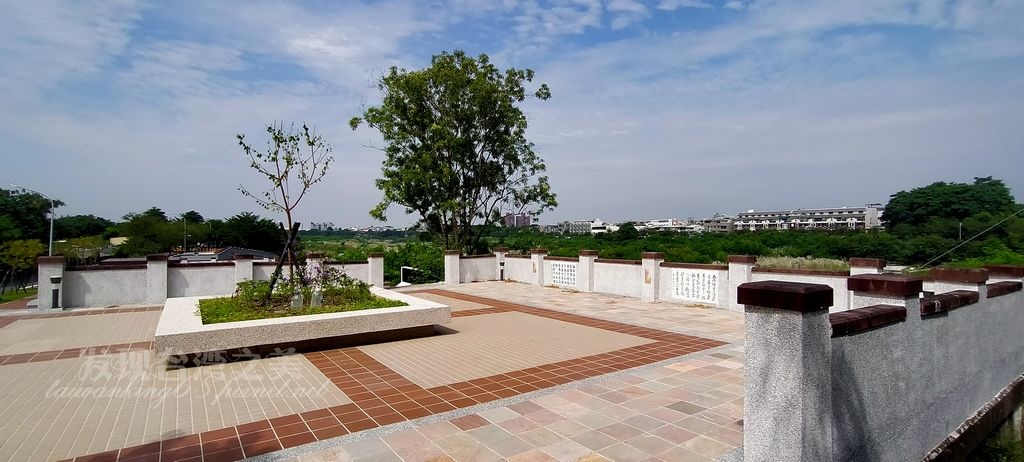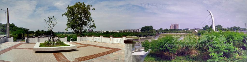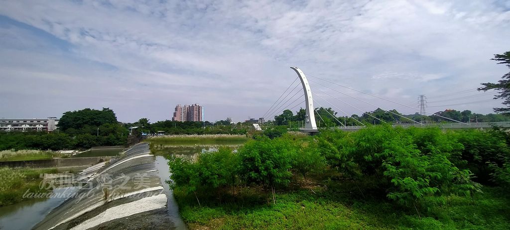 橫跨嘉義縣市的「彌陀映月橋」,連結了黃金風鈴木步道和河濱運動公園的全景圖。