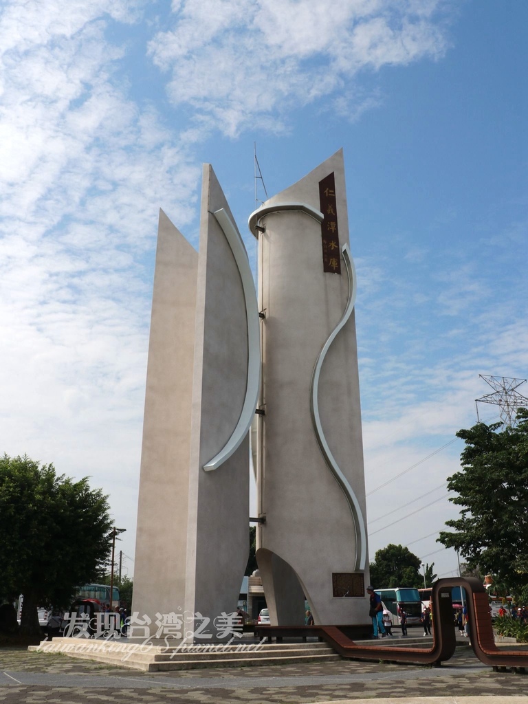 仁義潭水庫紀念碑,紀念碑旁設有涼亭,每逢週末會有街頭藝人在此做薩克斯風表演。
