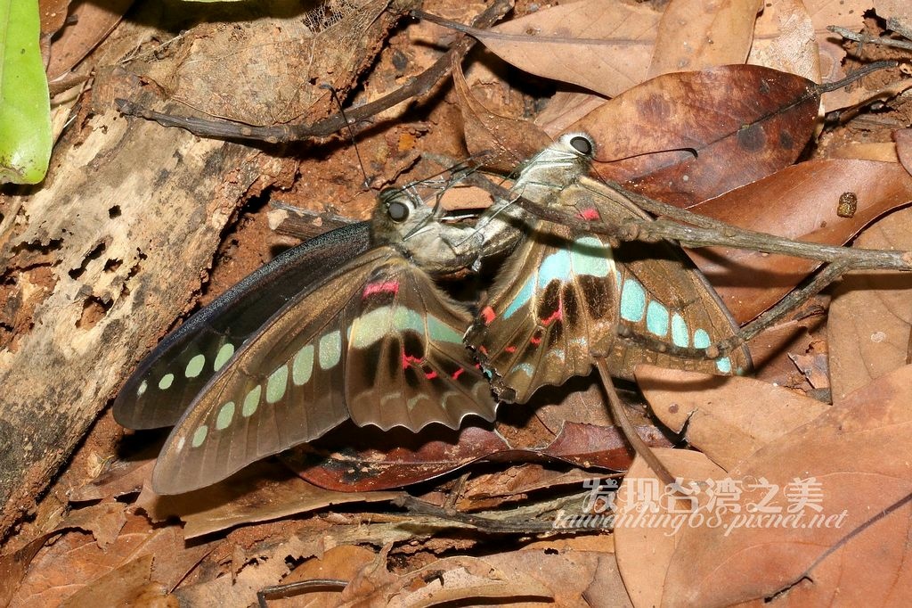在荒涼的路上有兩隻青帶鳳蝶打得火熱,從枝頭激戰到地面,還捨不得分開