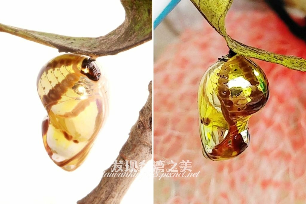蛹的顏色會隨著背景而改變,所以應以白色背景為準,蛹本身透明略帶金黃