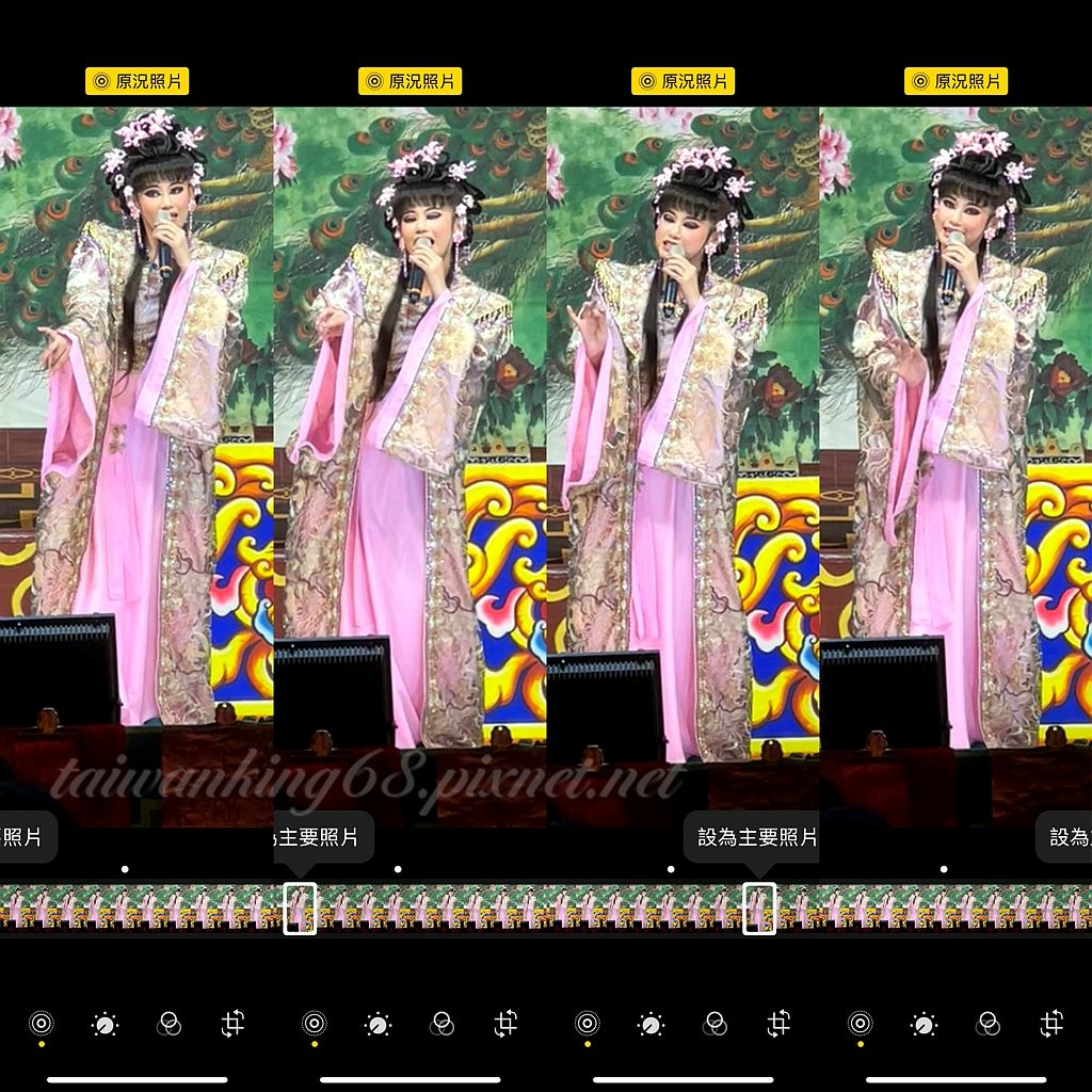 本文最後一張翠鳳戲劇照是用單眼照相機拍的外,其餘都是用3顆鏡頭的iPhone 13 Pro Max 6.7吋手機所拍攝,劇中人物的五官和色彩繽紛的戲服,全都能清楚的記錄下來;且都是於夜間距舞台卅公尺拍的照片。相片的畫質雖比不上單眼照相機,但張張相片沒有噪點,色彩和現場景色幾乎沒兩樣。