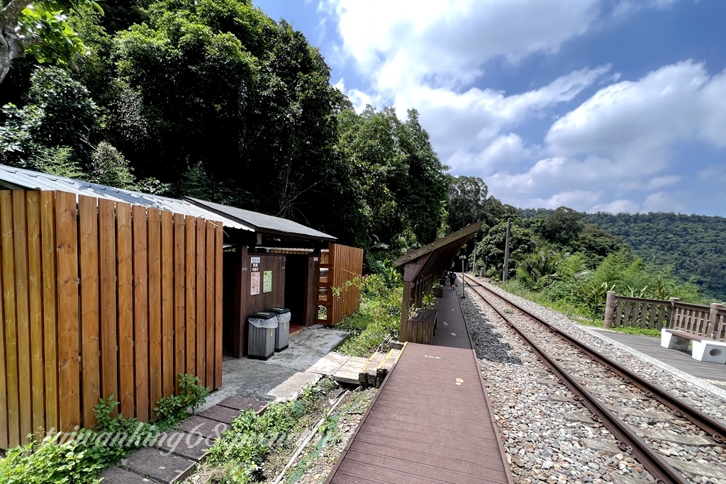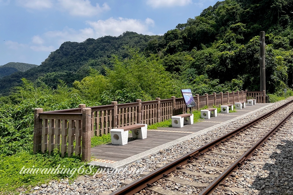 苗栗三義鯉魚潭舊鐵道沿途設有座椅供遊客歇息(↑)