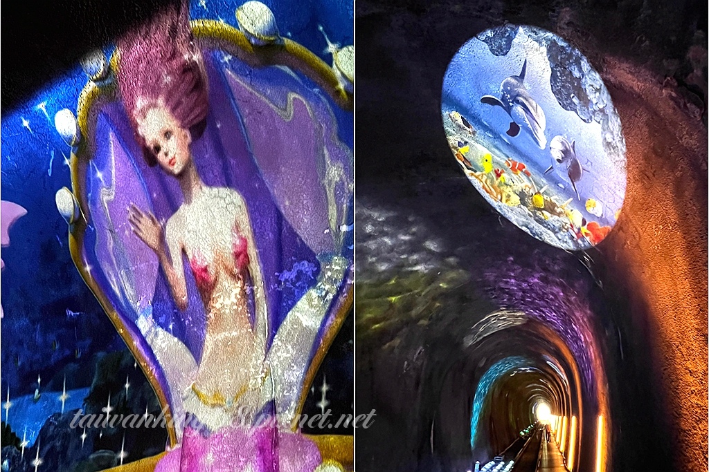 隧道內的燈光時而出現美人魚,不一會兒又變成一群在海中悠游的魚群