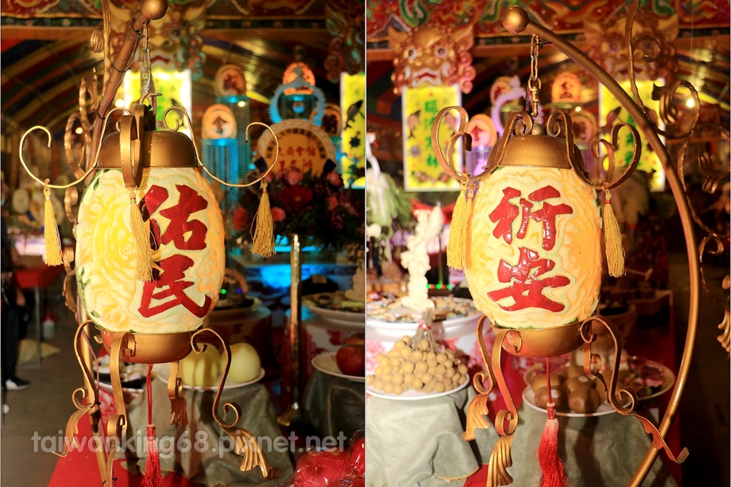 「陰光」應該就是指「普度燈」吧?農曆七月孤魂從陰間來到人間,點上一盞普渡燈,為這些來到人間的好兄弟照路,指引他們前行的方向,以避免好兄弟誤入家中。但在南瓜刻上斗大的《陰光敬奉》四個字,讓人感覺怪怪的?正確的完整字句應該是《陰光普照,某某敬奉》才對。