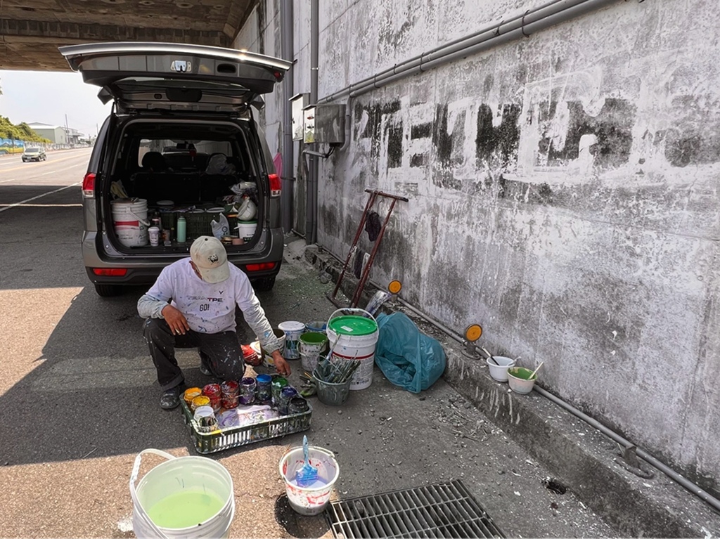 台中大甲北堤東路鐵路橋下北邊護岸坡完成彩繪後,現在又開始在南邊彩繪