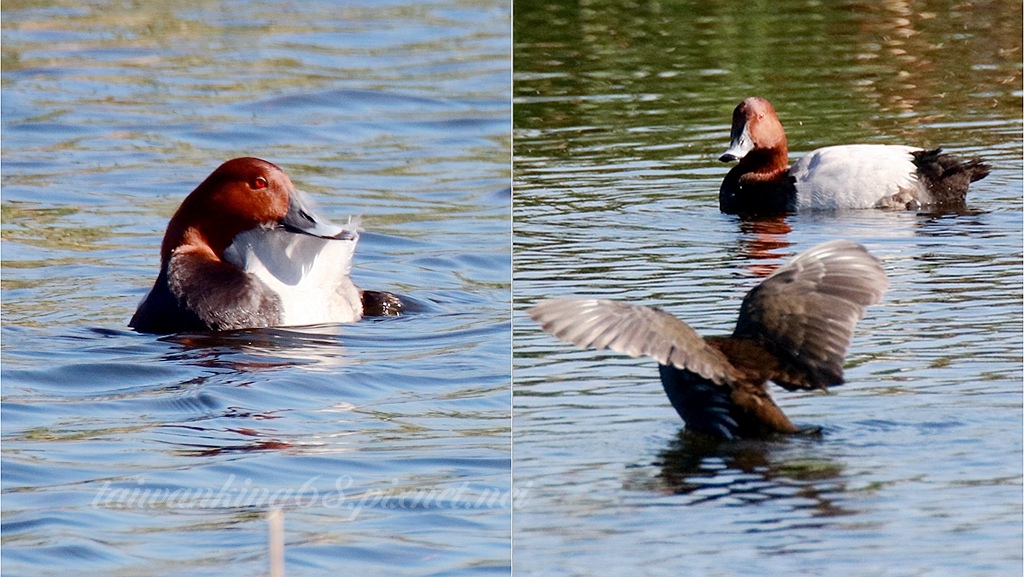 紅頭潛鴨奮力地拍打翅膀(↑)
