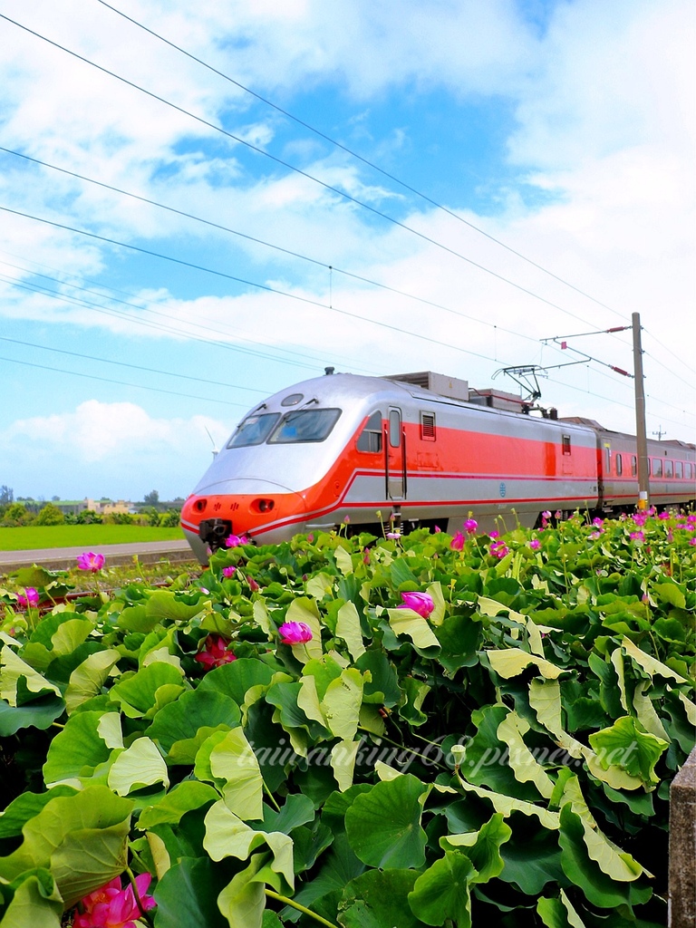 上圖(↑)就是拍攝《火車與荷花美麗相遇》的現場實況圖,荷花分別居於鐵路兩邊,拍攝者站在兩旁的產業道路拍照即可,應該不致於下田去取景拍照吧?