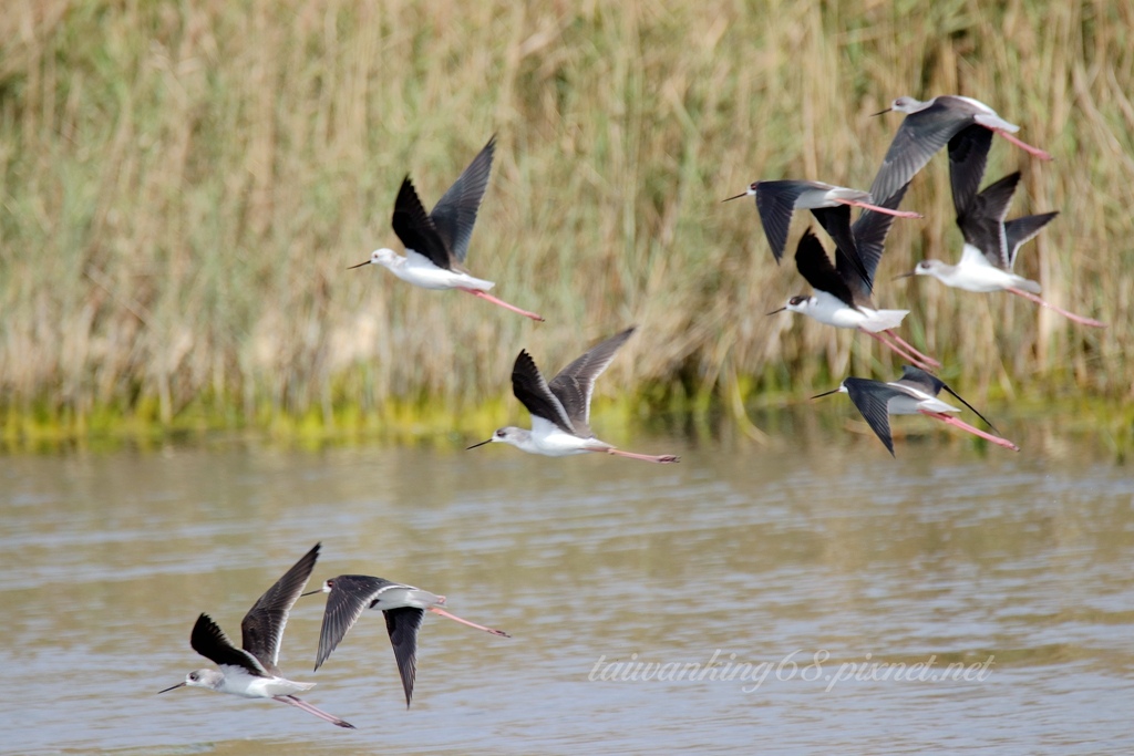 在台灣已成為普遍候鳥的高蹺鴴,約上百隻成群棲息在通霄魚塭(↑)