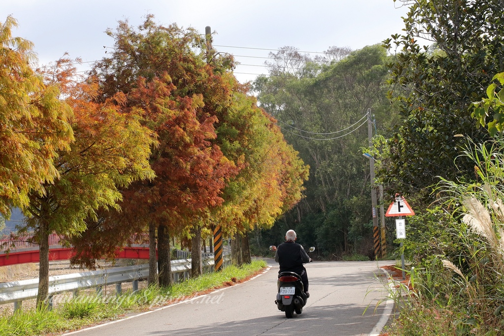 苗栗縣通霄鎮隱藏一條長達1.2公里的落羽松大道,松樹開始轉紅囉