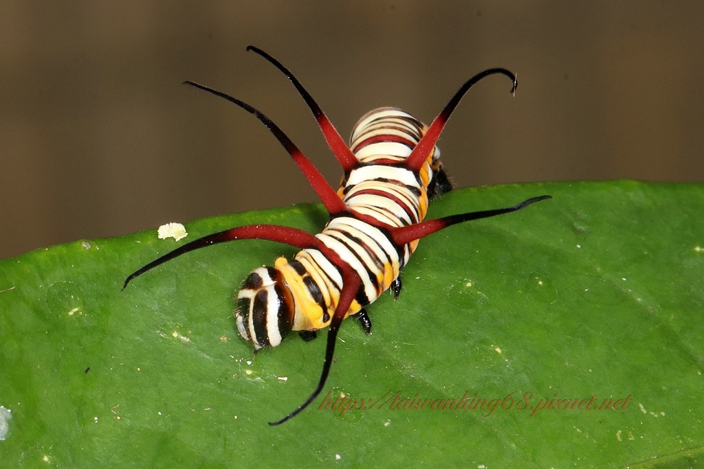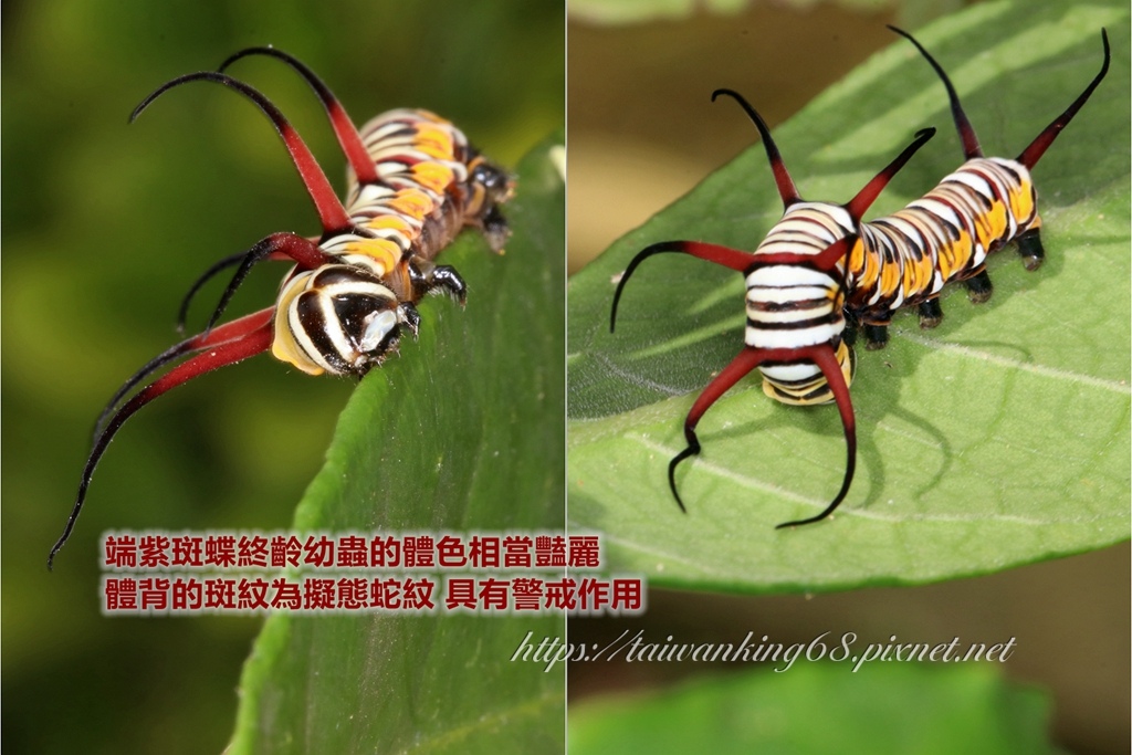 端紫斑蝶幼蟲體色艷麗,擬態蛇紋的身軀以及鮮紅的肉棘都具警示作用