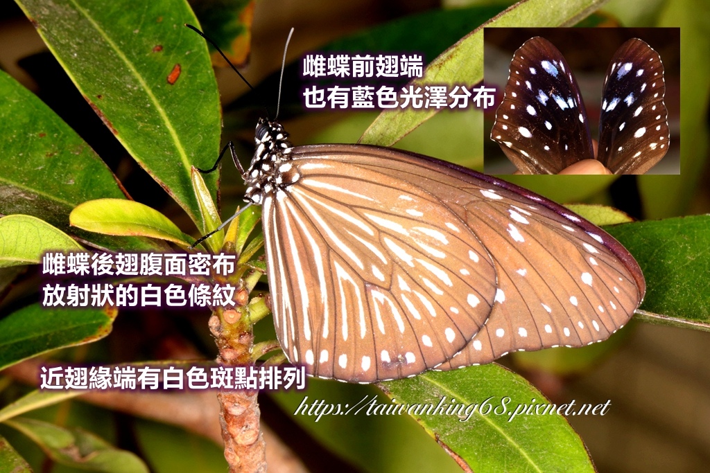 雌蝶前翅端因光線或個體差異,有些不具藍色光澤(↑)