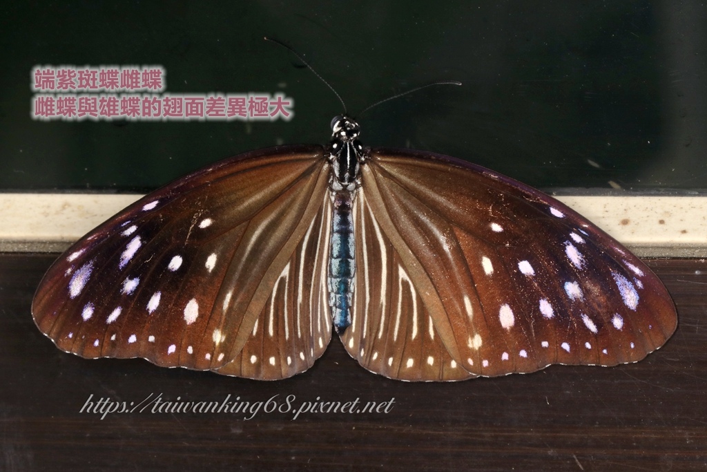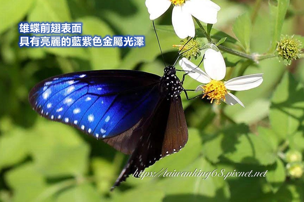 從上圖右(↗)可看到牠的前翅端部有些微的藍紫色金屬光澤;牠應該是雌蝶