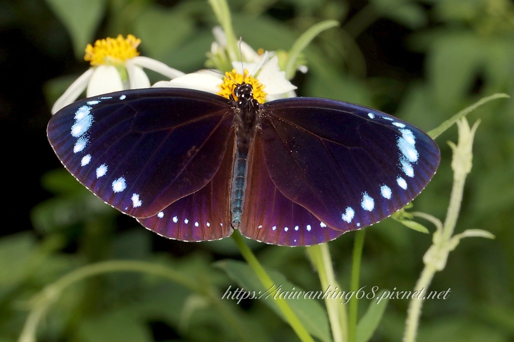 從上圖(↑)可看到牠的絨布翅面和散發著紫藍的琉璃光澤色,以及雙翅翅緣排列整齊的白色斑點。