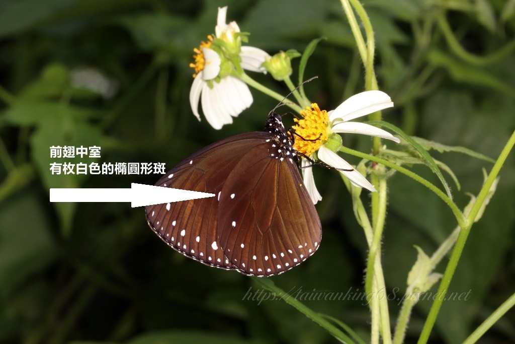 上圖為紫斑蝶翅腹面的翅緣有一排白色斑點(↑)