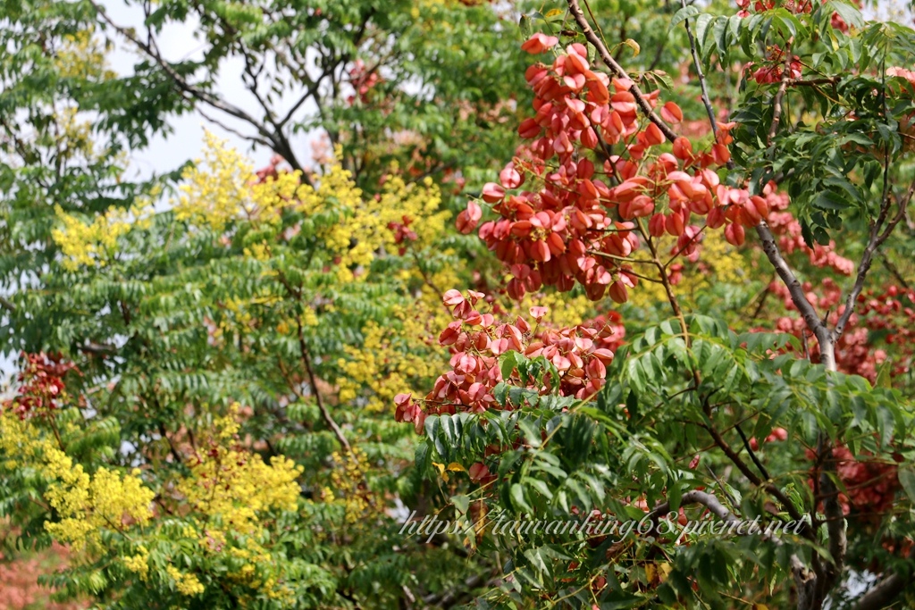 此時台灣欒樹金黃色花朵間會點綴著小紅色蒴果,形成一樹多種顏色的奇景。