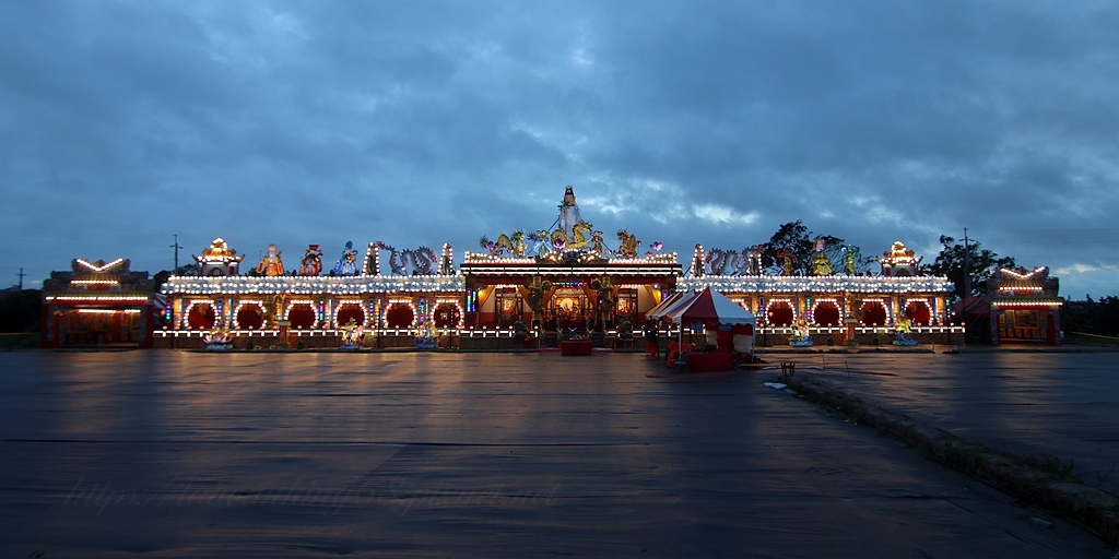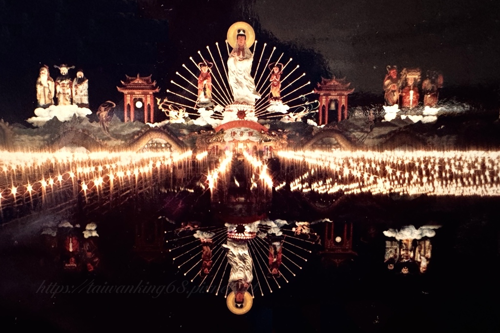 觀音壇前方會有數排燈火是當時正在普渡拜拜,會有倒影是地面鋪設黑塑膠網布。